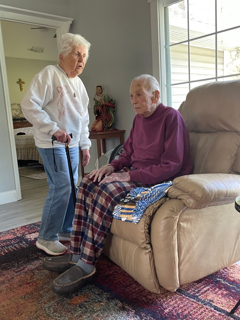 Back to our latest observations – Sometimes, we find him sitting on the edge of the bed, rationalizing to himself where everyone must be when no one answers him right away (On a recent morning, it was “MaryAnn must be at church”). When that happens, Mom is in bed right next to him, but his back is to her and he can’t turn to “see” her. We show up to help him get to the bathroom, loudly announcing our presence because he doesn’t have his hearing aids in yet. Once he’s on his feet and moving to the bathroom, Mom will wake up. Mom is also without her hearing aids at the moment. The ensuing shouting match is loud and epic and you can’t help walking away with a smile …