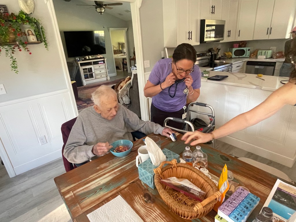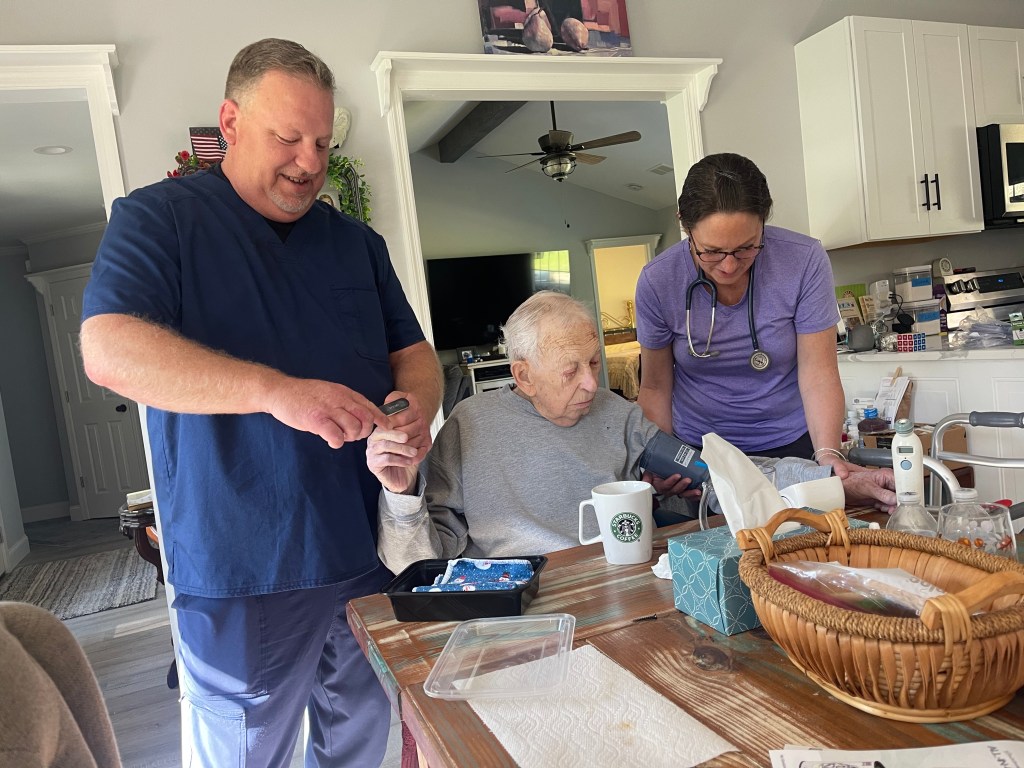 A new CNA nurse was assigned to Dad last week. Matthew took over for Abby, who took over for Shayla, who quit about three weeks ago. And no, she didn’t quit because of our family (I know you were thinking that!) … it was quite a long haul for her to make three times a week – an hour each way – and together with the fact she’s about to have a baby, she decided to move on. Anyway, here’s a picture of Matthew and our very extra special nurse, Kim, tending to Dad on one of Matthew’s first days. Kim is the most patient, caring and compassionate nurse I’ve ever met. Just look how happy Dad looks!