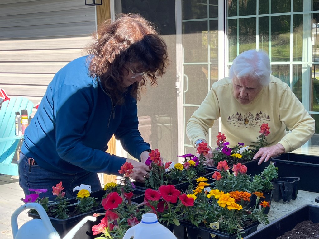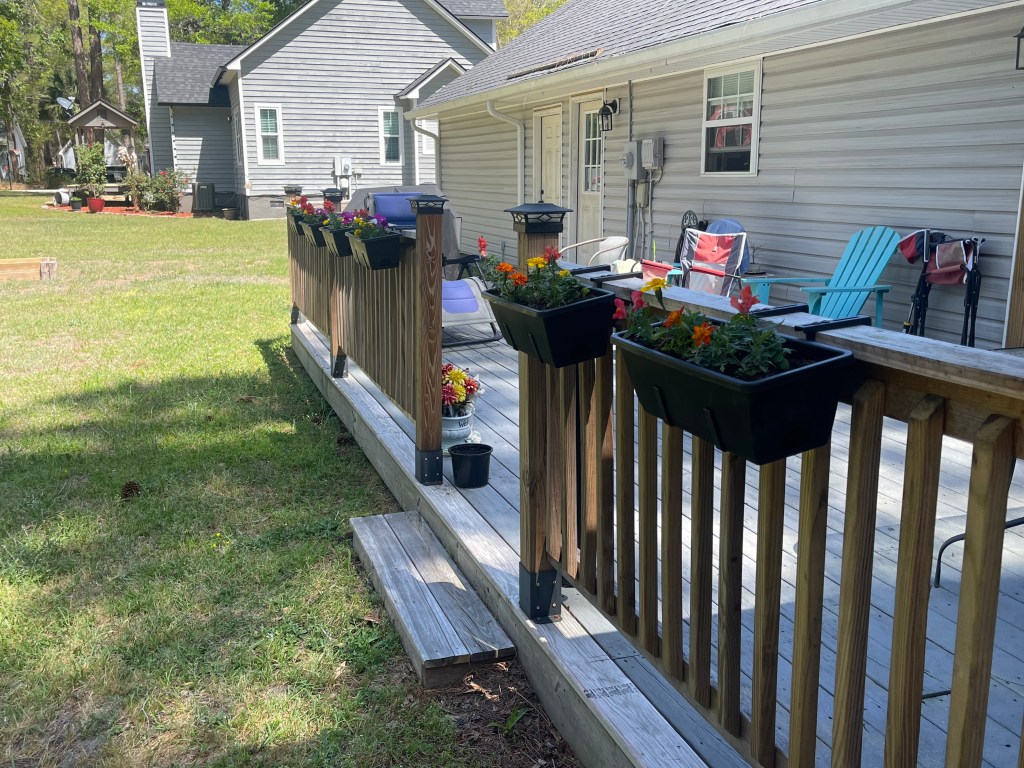 I think we’re putting down roots here – literally (another reference to trees)! Trish picked up some “over-the-railing” planters for the back deck, Dave was kind enough to secure them to the railing and Mom and Trish planted some flowers this past week. They look great … and so do the flowers!
